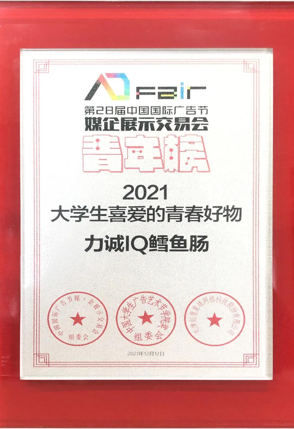广告节青年榜是一个从年轻人角度出发,记录、考评青春活力的奖项。 力诚通过加强与当代青年的联系,紧跟时代的步伐,成功占据当代青年心中的重要地位,深受当代年轻人的喜爱。 在12月12日的青春盛典上,力诚荣获本届青年榜中“2021大学生喜爱的活力品牌”;力诚IQ鳕鱼肠荣获“2021大学生喜爱的青春好物”。